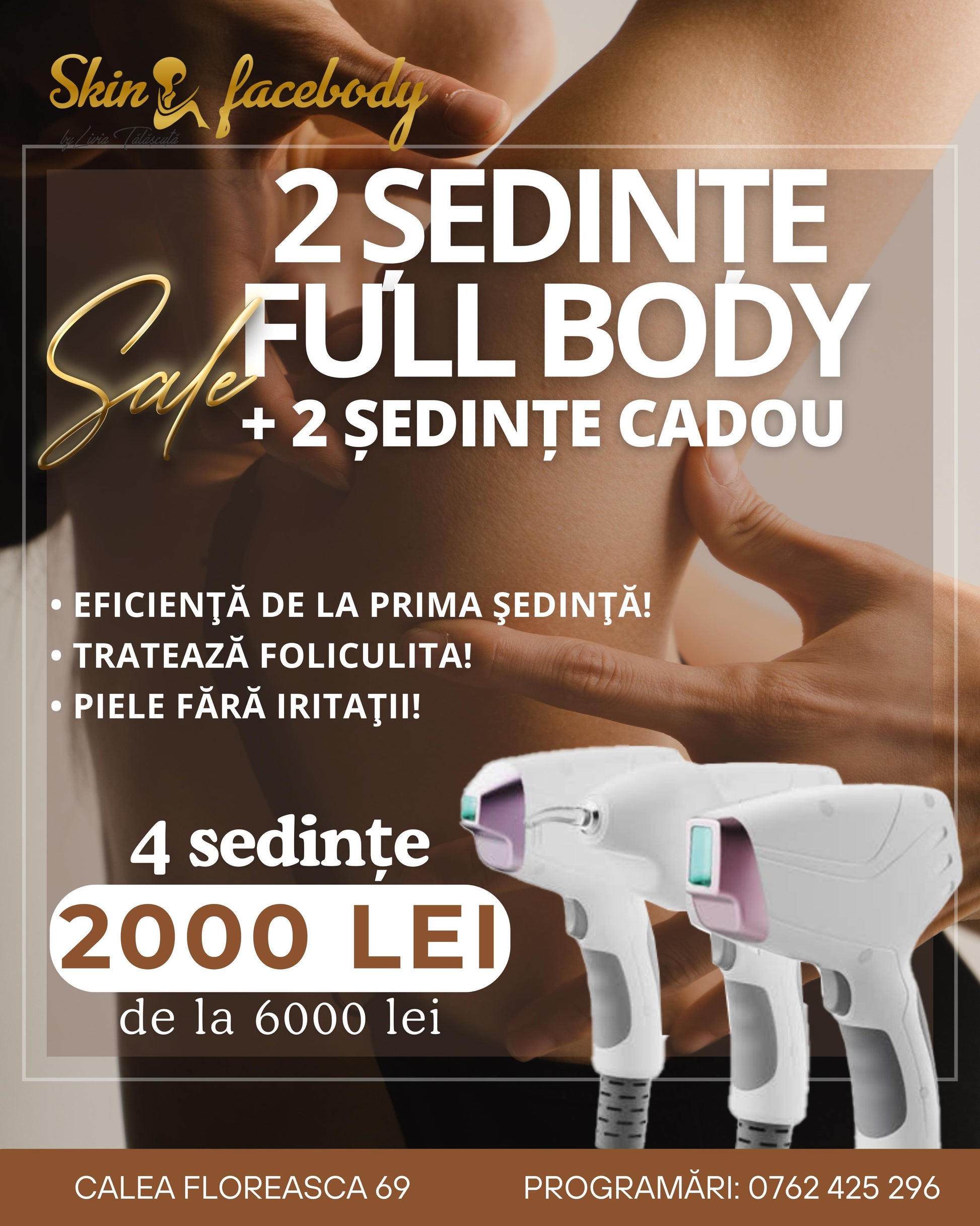 Pachet complet de 4 ședințe Full Body (plătești 2 și primești 2 cadou), pentru o epilare definitivă eficientă și rapidă. Ideal pentru piele sensibilă, fără iritații și fără foliculită, cu rezultate vizibile încă de la prima ședință.
